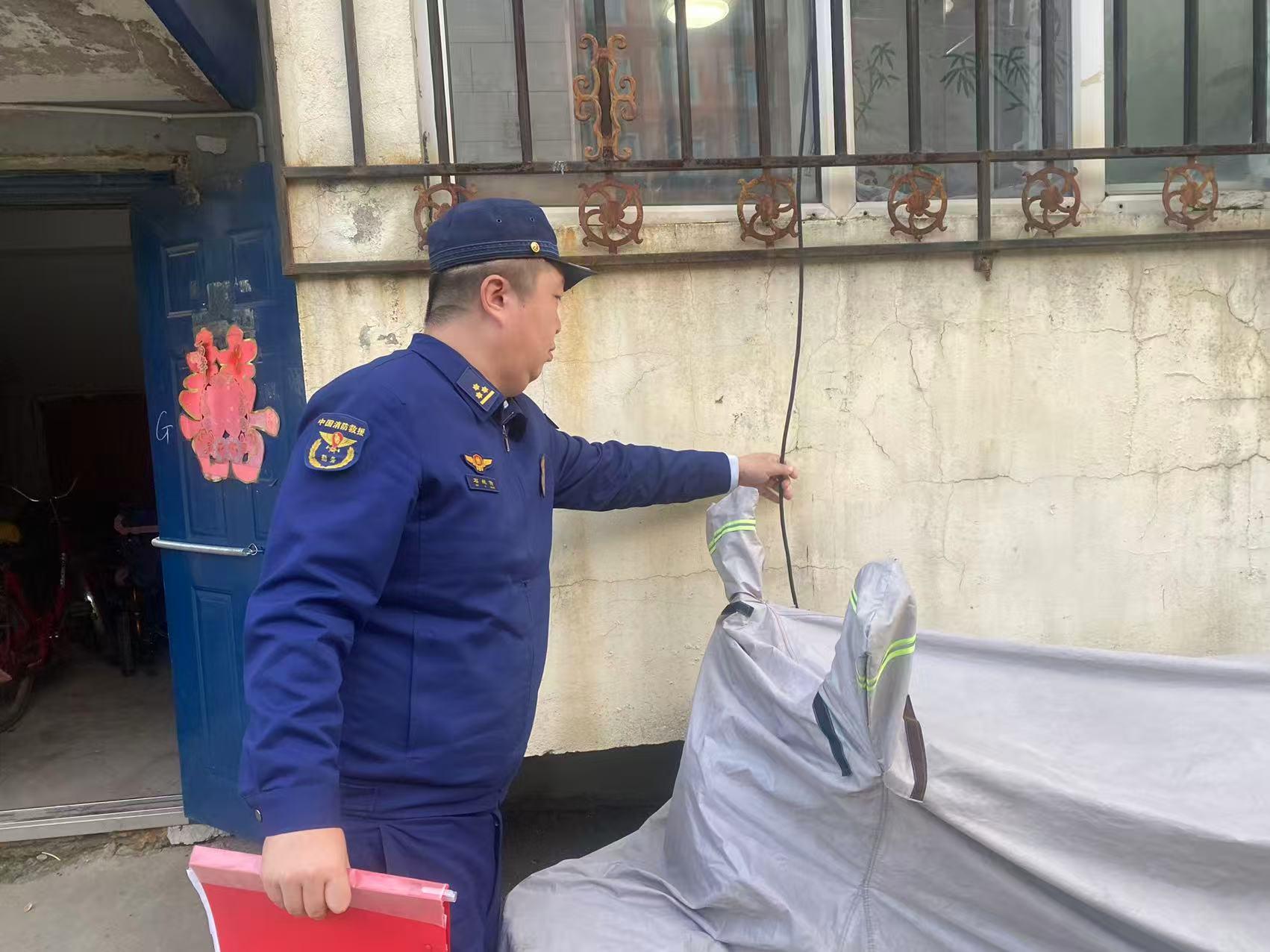 塔河縣消防救援大隊執(zhí)法人員深入居民樓區(qū)開展電動車飛線充電隱患排除活動(孫珍珍 攝)