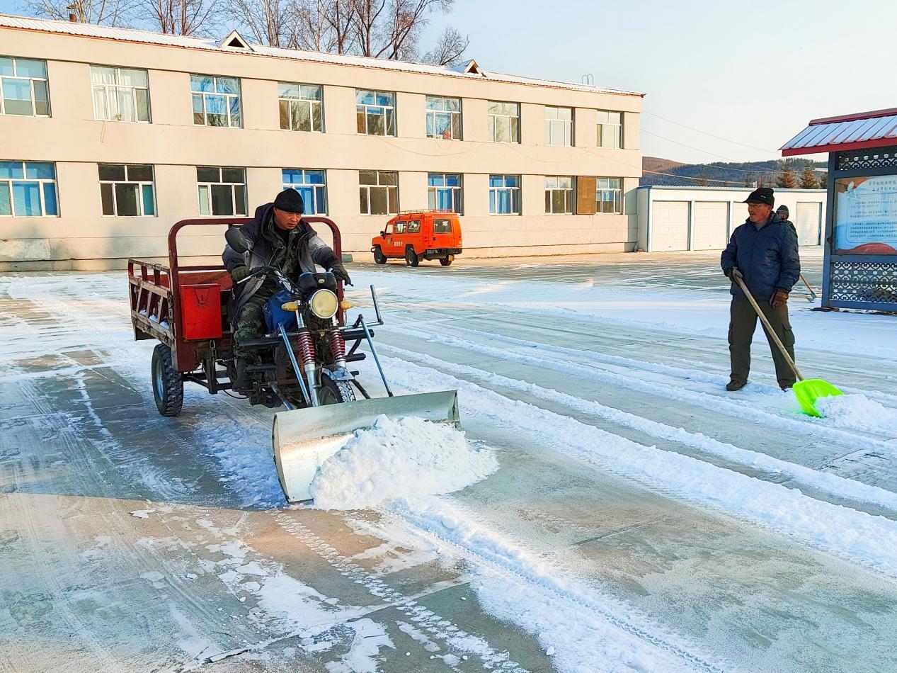 清雪現(xiàn)場,干部職工們嚴格遵循“即下即清、雪停路凈”的原則,不畏凜冽寒風,迅速投入戰(zhàn)斗。大家分工協(xié)作,形成了“機械+人工”的高效清雪模式。職工們各展所長,有人駕駛自制清雪車清理積雪,有人用推雪板歸集散雪,還有人手持雪鏟、吹雪機細致清理人行道縫隙等邊角區(qū)域。經(jīng)過近3小時的奮戰(zhàn),林場責任區(qū)內(nèi)的積雪被清除干凈,露出了整潔的路面和暢通的通道,為職工群眾和過往車輛安全通行清出了一片“平安路”。