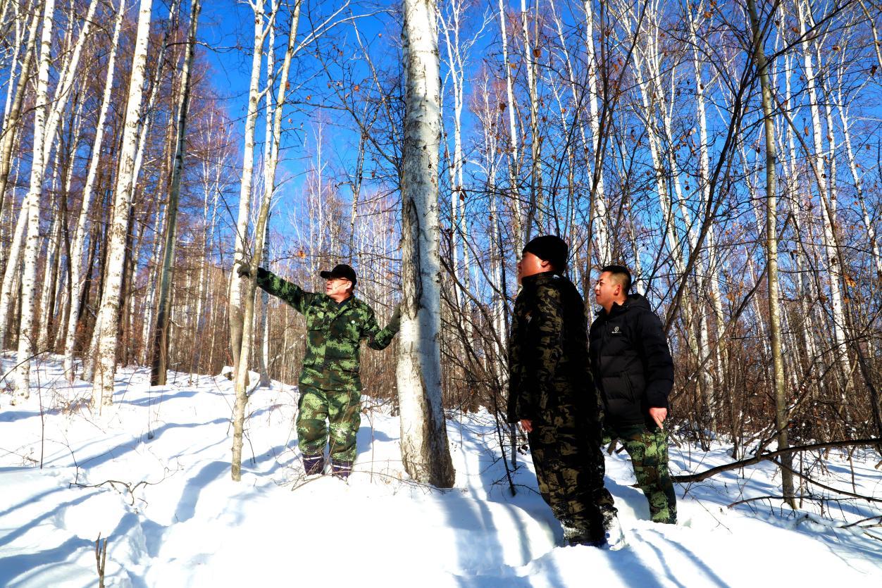 阿木爾林業(yè)局產(chǎn)業(yè)發(fā)展科工作人員在樺樹汁采集地塊,實(shí)地了解樺樹胸徑等情況(王力 攝)