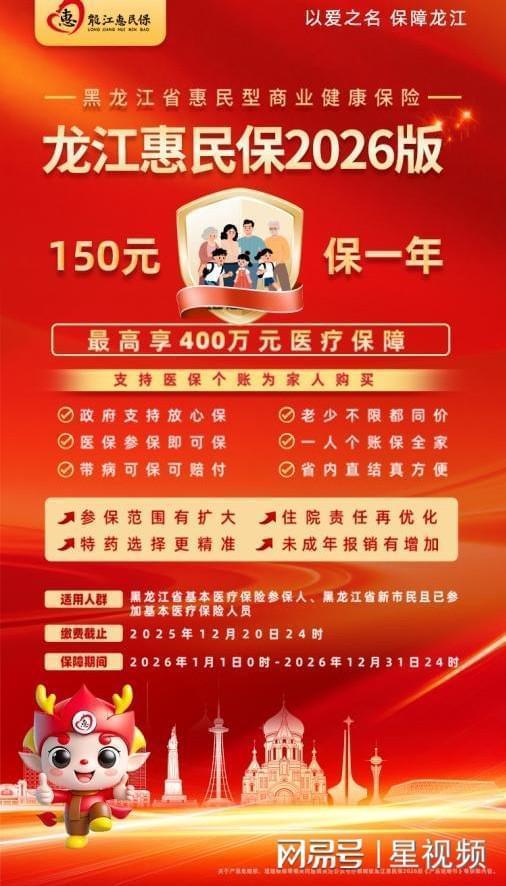 “龍江惠民保2026版”參保通道僅剩最后五天,將于2025年12月20日24時(shí)正式關(guān)閉。凡黑龍江省基本醫(yī)保參保人,只需通過(guò)“龍江惠民?!蔽⑿殴娞?hào)即可參保,每人每年150元,最高享400萬(wàn)元醫(yī)療保障。