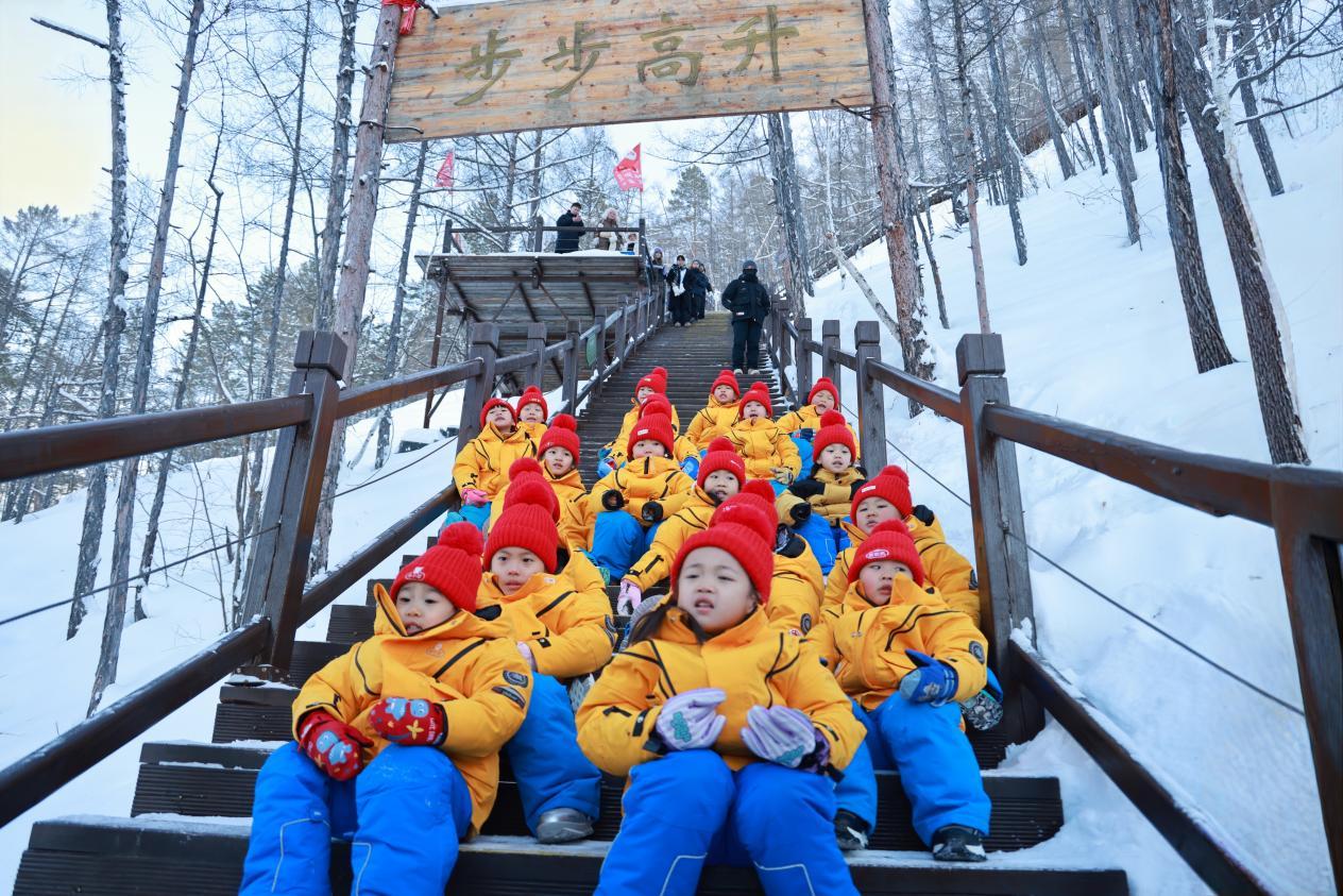 孩子們排成一串靈動(dòng)的小隊(duì),踩著積雪在棧道上噠噠前行,腳下“咯吱咯吱”的清脆聲響,為這場(chǎng)研學(xué)之旅奏響歡快序曲。軟糯的廣西口音此起彼伏,孩子們或好奇地觸摸棧道積雪,冰涼的觸感讓他們瞇起眼睛直跺腳;或緊緊抓著欄桿,任憑小臉凍得通紅,仍目不轉(zhuǎn)睛眺望遠(yuǎn)方“Ω”形的冰封江灣,沉浸式感受北國(guó)冰雪的奇妙。那一抹抹跳動(dòng)的橘色,在純白世界中宛如一團(tuán)團(tuán)小火苗,格外耀眼。