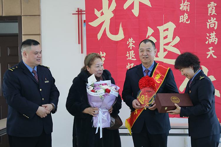 客運(yùn)段團(tuán)委書(shū)記張蔚萌代表段黨委,為馮春生同志送上誠(chéng)摯的祝福,并鄭重地遞上鐫刻著“光榮退休”字樣的紀(jì)念牌。緊接著,班組精心準(zhǔn)備的一份“驚喜”將現(xiàn)場(chǎng)氣氛推向高潮——馮春生同志的愛(ài)人捧著鮮花,在大家的掌聲中走上臺(tái)來(lái)。夫妻二人相視而笑,這份來(lái)自家庭的溫暖與支持,讓馮春生同志感動(dòng)不已。