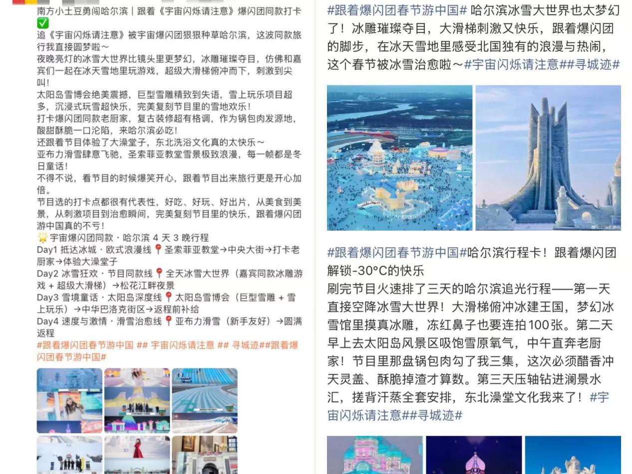 “跟著爆閃團(tuán)春節(jié)游中國”打卡活動的開展,讓屏幕里的冰雪快樂照進(jìn)了現(xiàn)實(shí)。游客們紛紛追隨宇宙爆閃團(tuán)的腳步,在冰雪大世界打卡拍照,在太陽島雪博會邂逅巨型雪雕,在亞布力滑雪場體驗(yàn)飛馳的快樂,在老廚家品嘗節(jié)目同款美食。