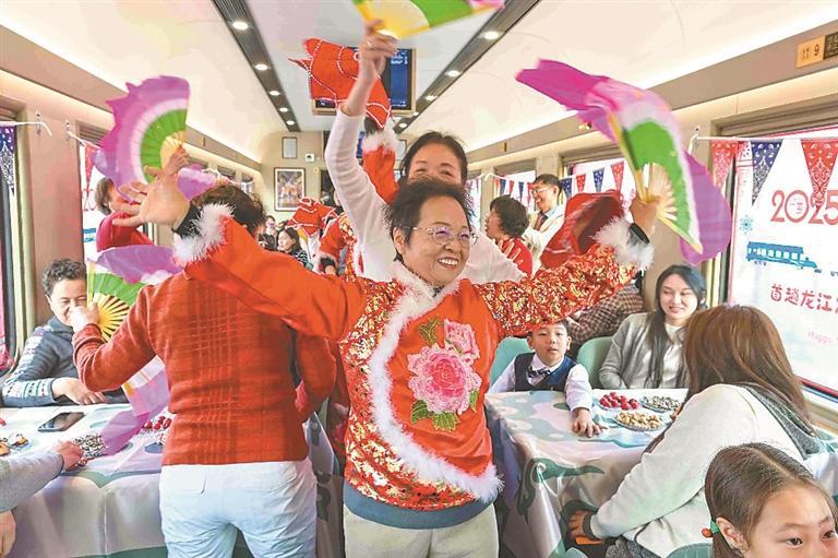 在冰雪環(huán)線旅游列車上,游客換上民俗服飾與工作人員迎接新年。原勇攝