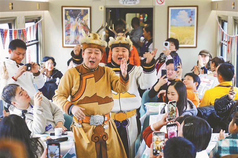 2月5日18時(shí)20分,K7041次“東北大花”主題列車從哈爾濱站緩緩駛出,一路向北,駛向漠河。車廂內(nèi),來(lái)自大興安嶺的鄂倫春族非遺代表性傳承人,現(xiàn)場(chǎng)展示用樺樹(shù)皮制作的手工藝品,列車工作人員身著民俗服飾帶領(lǐng)游客剪窗花,東北秧歌、二人轉(zhuǎn)表演更是點(diǎn)燃了旅途熱情。